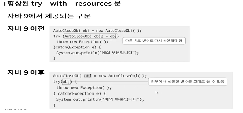 - 해당 리소스가 AutoCloseable을 구현한 경우 close()를 명시적으로 호출하지 않아도
