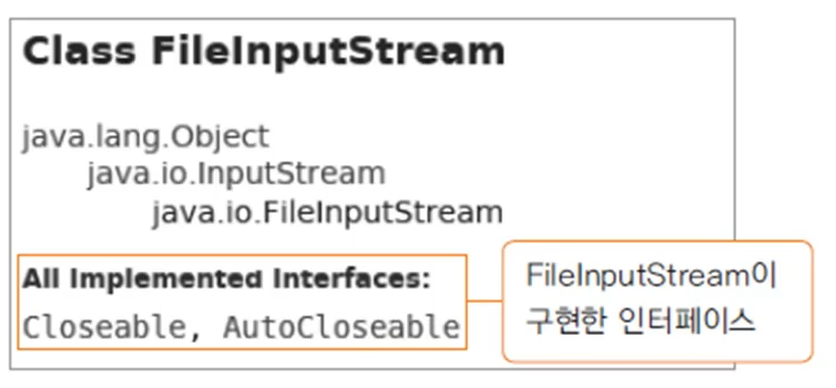 - FileInputStream의 경우 AutoCloseable을 구현 하고 있음.