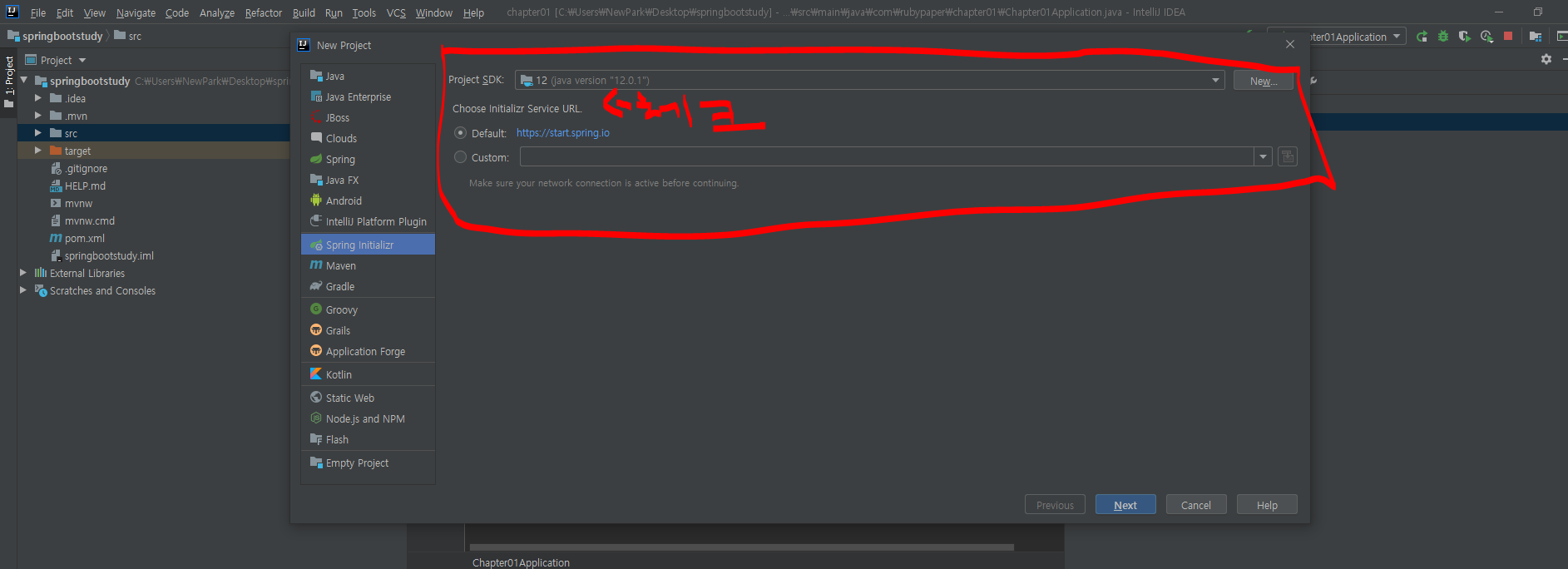 3. [Project SDK] 선택 (java 몇버전으로 사용 할 것 인가에 대한 설정) 현재 자바 (12.0.1)