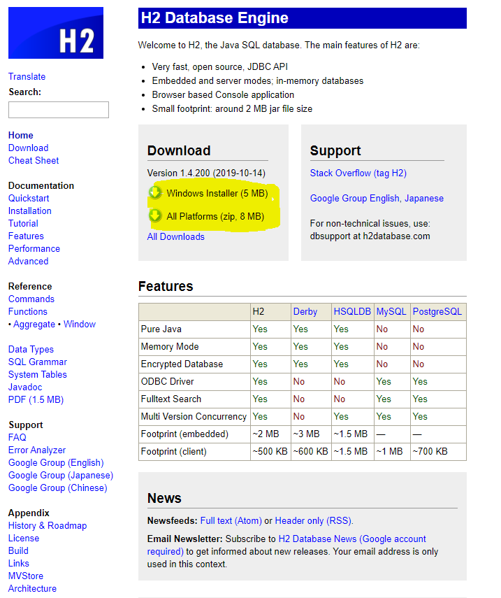 위의 주소로가서 H2 Database에 접속하면 아래와 같은 화면이 제공되어 다운로드가 가능하다.