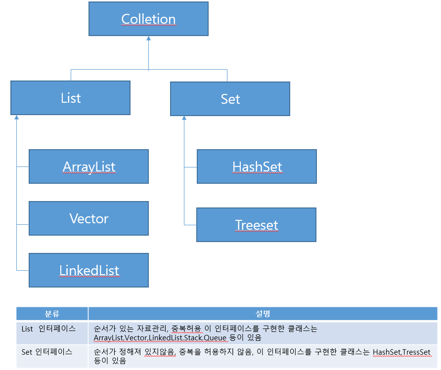 컬렉션 프레임워크(Collection Framework) - 프로그램 구현에 필요한 자료구조(data structure)와 알고리즘을 구현해 놓은 라이브러리 - java.util 패키지에 구현되어 있음 - 개발에 소요되는 시간을 절약하고 최적화된 라이브러리를 사용할 수 있다. - Colletion 인터페이스와 Map 인터페이스로 구성되어 있다. Colletion 인터페이스 - 하나의 객체의 관리를 위해 선언된 인터페이스로 필요한 기본 메서드가 선언되어 있다. 하위에 List,Set 인터페이스가 있다. push(),pop(),dequeue()(빼는것),enqueue()(넣는것) hashtable 검색해보기 hash -> 검색을 위한 조건,검색을 위한 알고리즘 index= hash(key) -> 키를 주면 ..